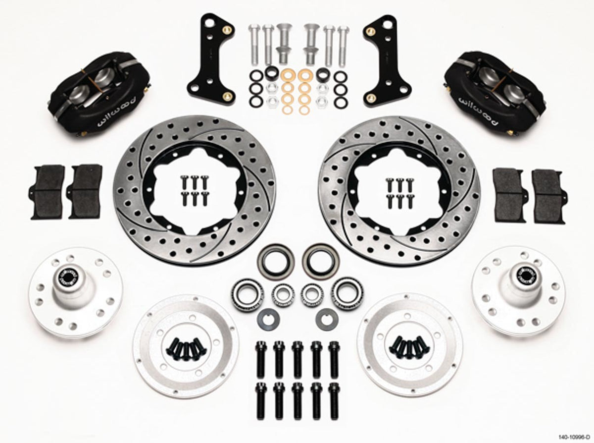 Brake System - Dynalite - Front - 4 Piston Caliper - 11.000 in Drilled / Slotted Iron Rotor - Offset - Aluminum - Black Powder Coat - GM A-Body / F-Body / X-Body 1964-74 - Kit