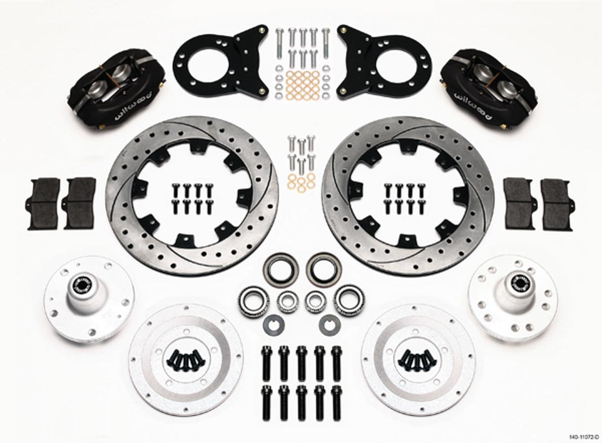 Brake System - Forged Dynalite Big Brake - Front - 4 Piston Caliper - 12.190 in Drilled / Slotted Iron Rotor - Offset - Aluminum - Black Powder Coat - Ford Mustang 1965-70 - Kit