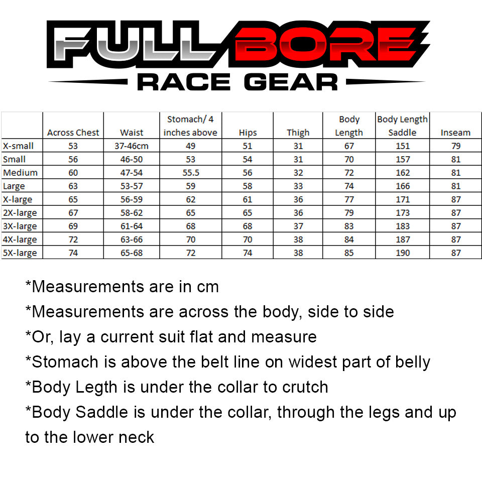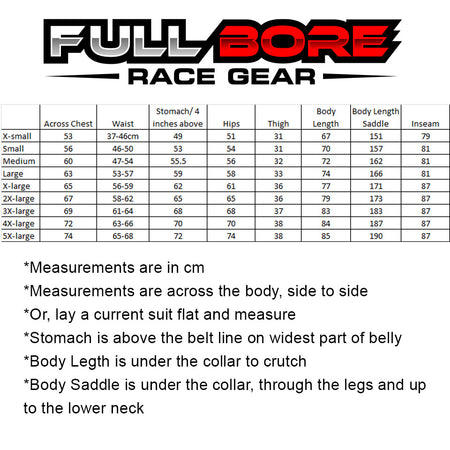 FULL BORE Race Gear's -SJ13- single layer suit is manufactured to provide Driver Safety and comfort. Made from quality fire retardant Cotton, these suits are classic and hardwearing.